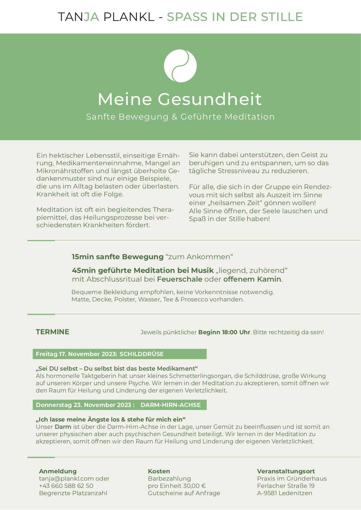 • keine spezielle Kleidung notwendig (Yogamatten, Decken, Polster sind vor Ort)